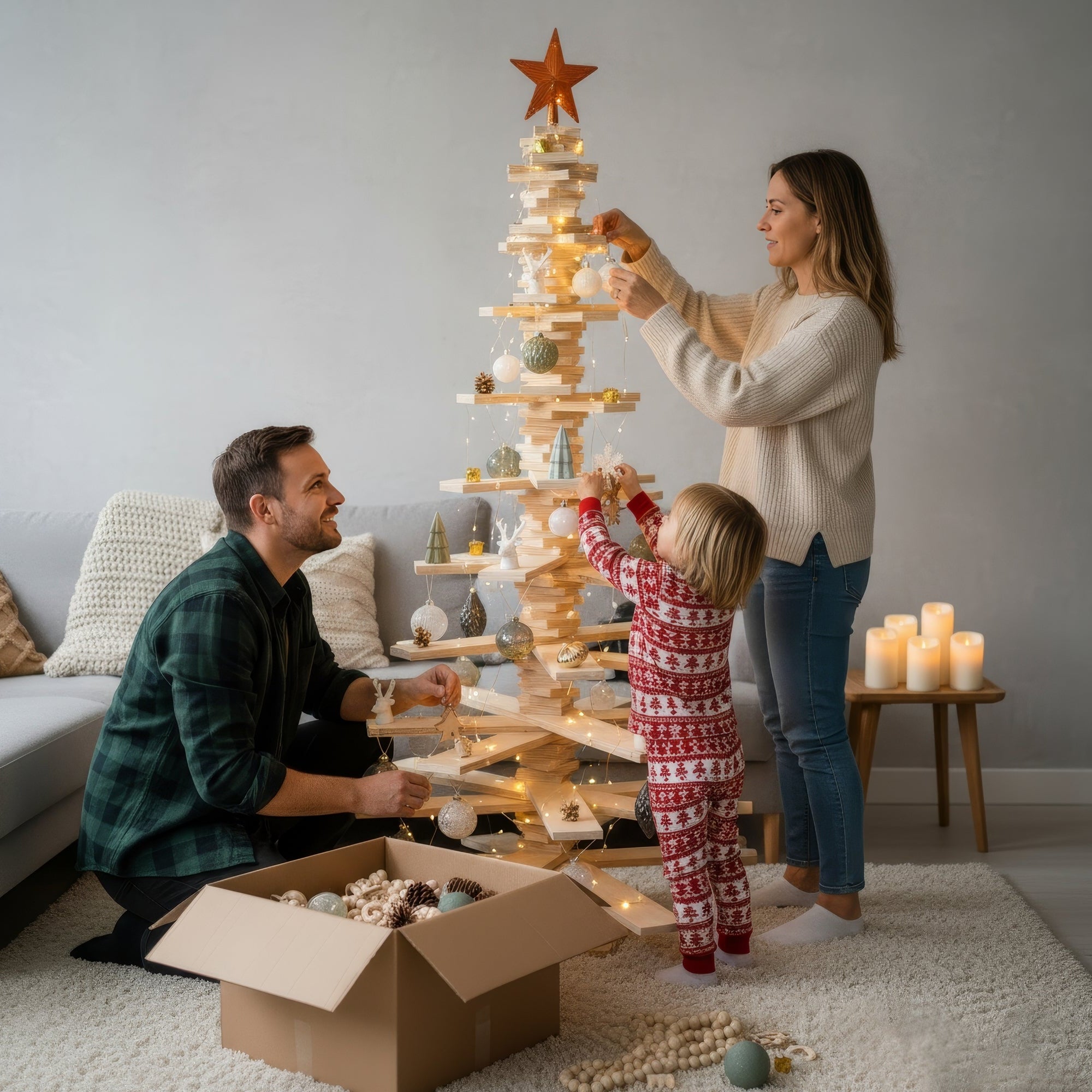 Construisez un Noël inoubliable en famille avec notre sapin en bois design et modulable, fait main en France.